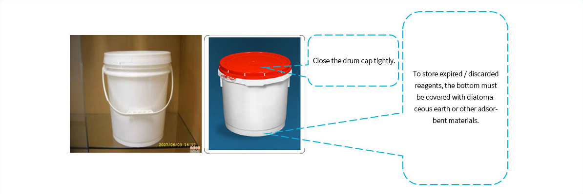 Note! High-concentration halogen, acid and toxic liquid waste should be stored in containers with a volume of ≤ 5L